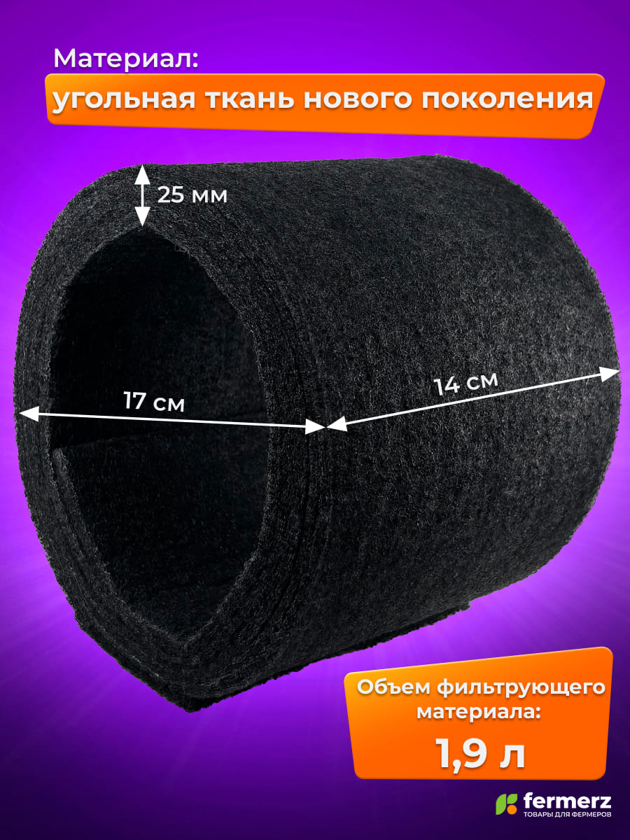 Объём фильтрующего материала — 1,9 л, толщина слоя — 25 мм, что обеспечивает большую площадь контакта и высокую эффективность. Низкое сопротивление ткани даёт высокую пропускную способность воздуха, не создавая лишней нагрузки на систему вентиляции.