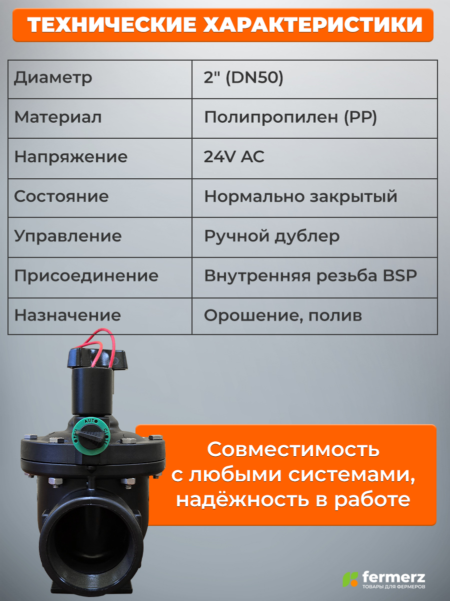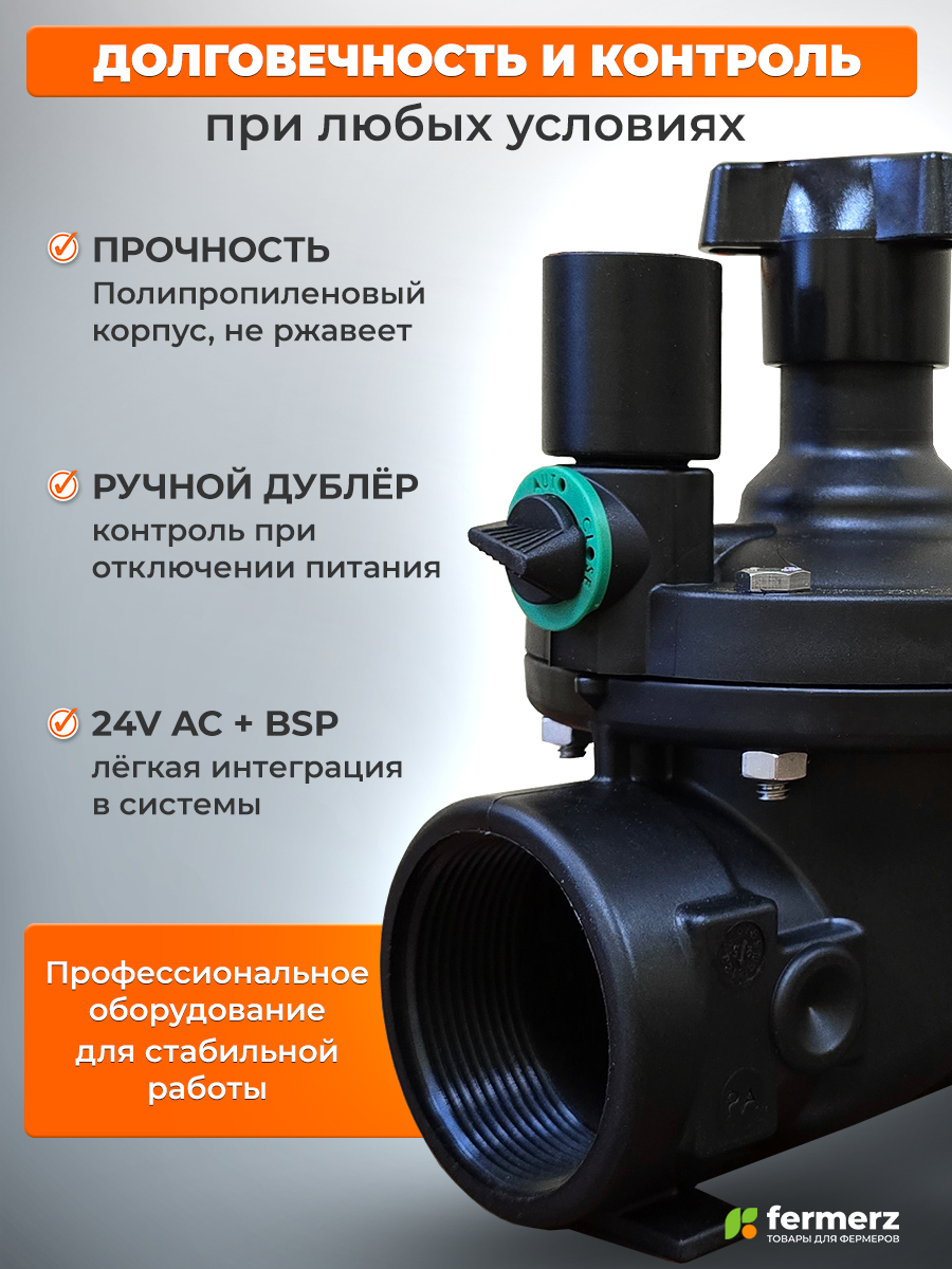 Это профессиональное решение для управления магистральными линиями полива. Его ключевое преимущество — функция плавного закрытия (Soft-Close), которая защищает систему от разрушительных гидроударов, сохраняя трубы и фитинги. Полностью полипропиленовый корпус устойчив к коррозии и удобрениям, а ручное дублирование и стандартное напряжение 24V AC обеспечивают бесперебойную и простую интеграцию в любую систему автоматического полива.