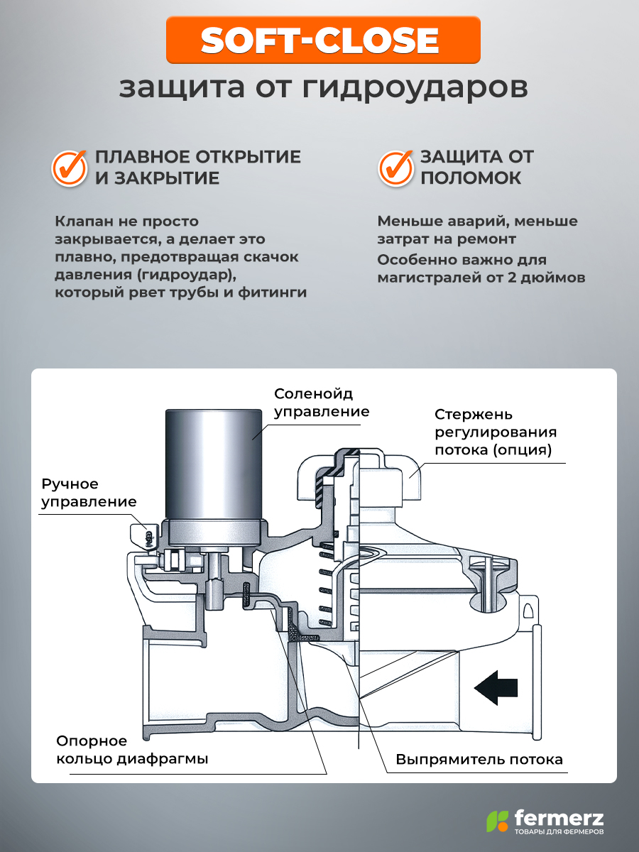 Выгода: Снижение риска аварий и значительная экономия на ремонте. Это фактически страхование всей системы полива, особенно актуально для магистралей от 2 дюймов и более.