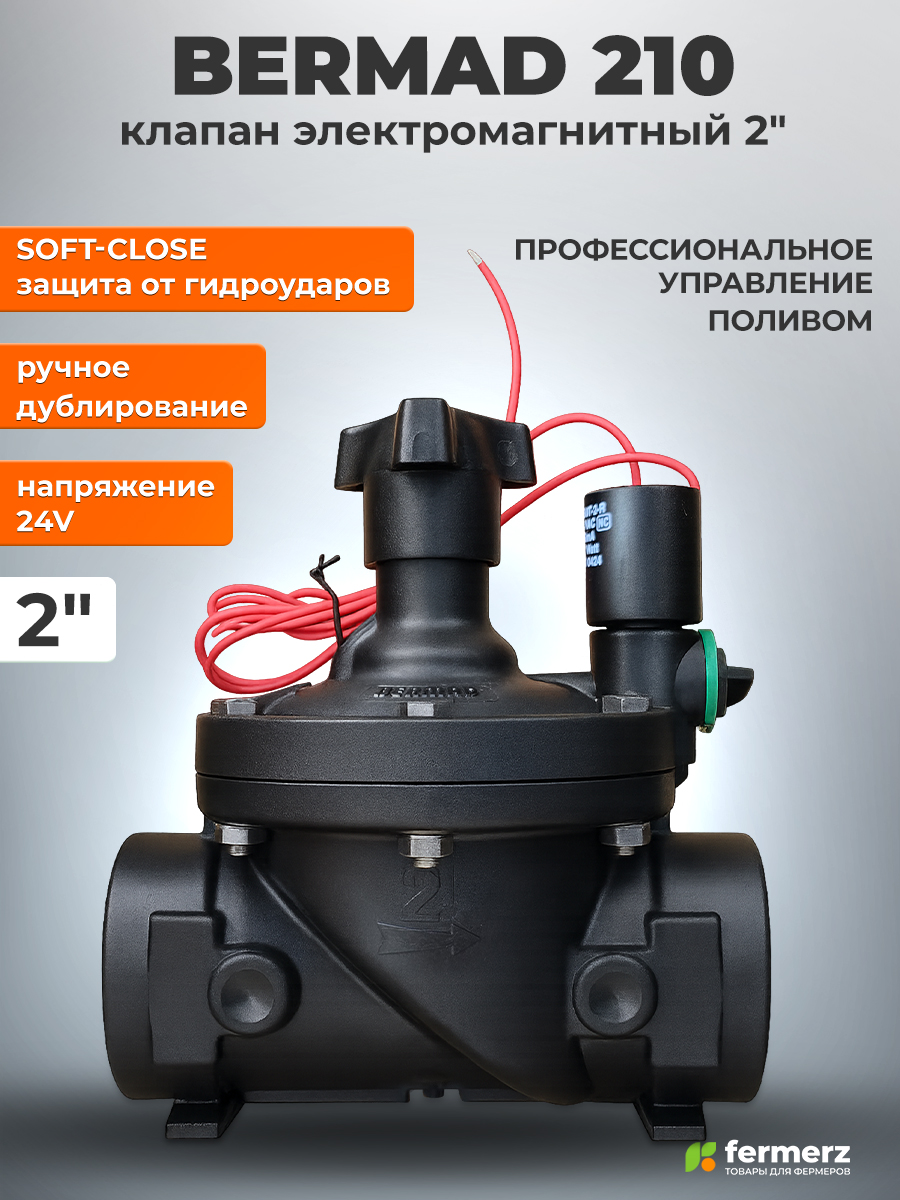 Электромагнитный клапан Bermad 2″ — это профессиональное решение для управления магистральными линиями полива. Его ключевое преимущество — функция плавного закрытия (Soft-Close), которая защищает систему от разрушительных гидроударов, сохраняя трубы и фитинги. Полностью полипропиленовый корпус устойчив к коррозии и удобрениям, а ручное дублирование и стандартное напряжение 24V AC обеспечивают бесперебойную и простую интеграцию в любую систему автоматического полива.