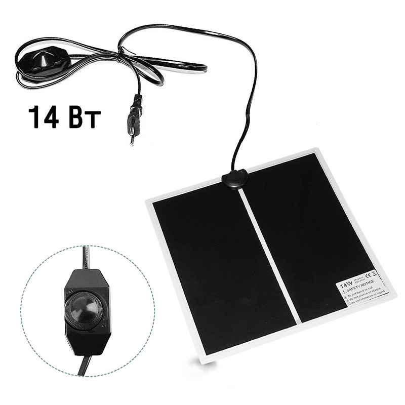 ПРИЧИНА УЦЕНКИ: ПОВРЕЖДЕНИЕ УПАКОВКИ, НЕБОЛЬШИЕ ЦАРАПИНЫ НА КОВРИКЕ. РАБОТОСПОСОБНОСТЬ И ГАРАНТИЯ СОХРАНЕНЫ. Греющий коврик для подогрева (термоковрик) мощностью 14 Ватт. Сферы применения: для подогрева террариумов рептилий, черепашек, змей, лягушек, пауков и т.п. Помимо этого применяется в хозяйственном назначении: подогрев рассады, погребов для овощей, сушки обуви, сушки овощей и т.д. Снабжён регулятором нагрева.