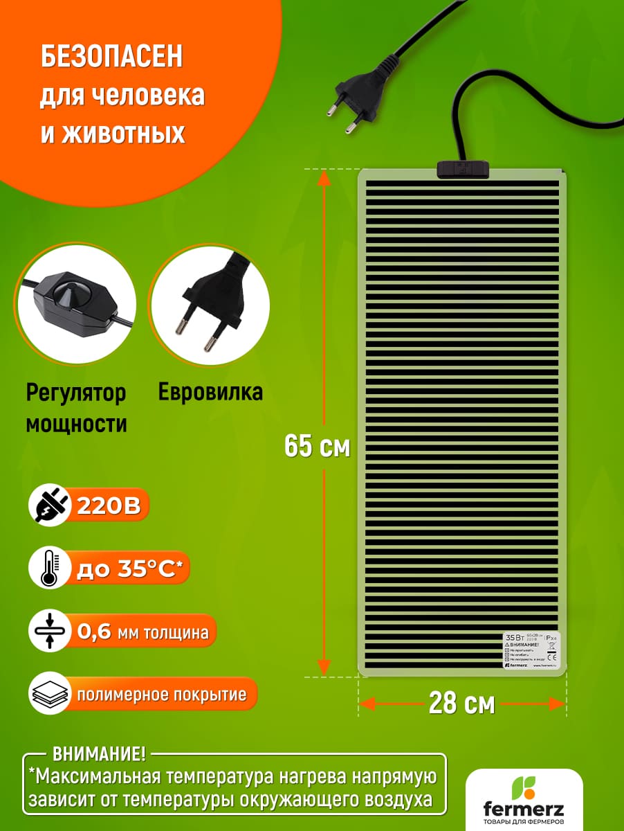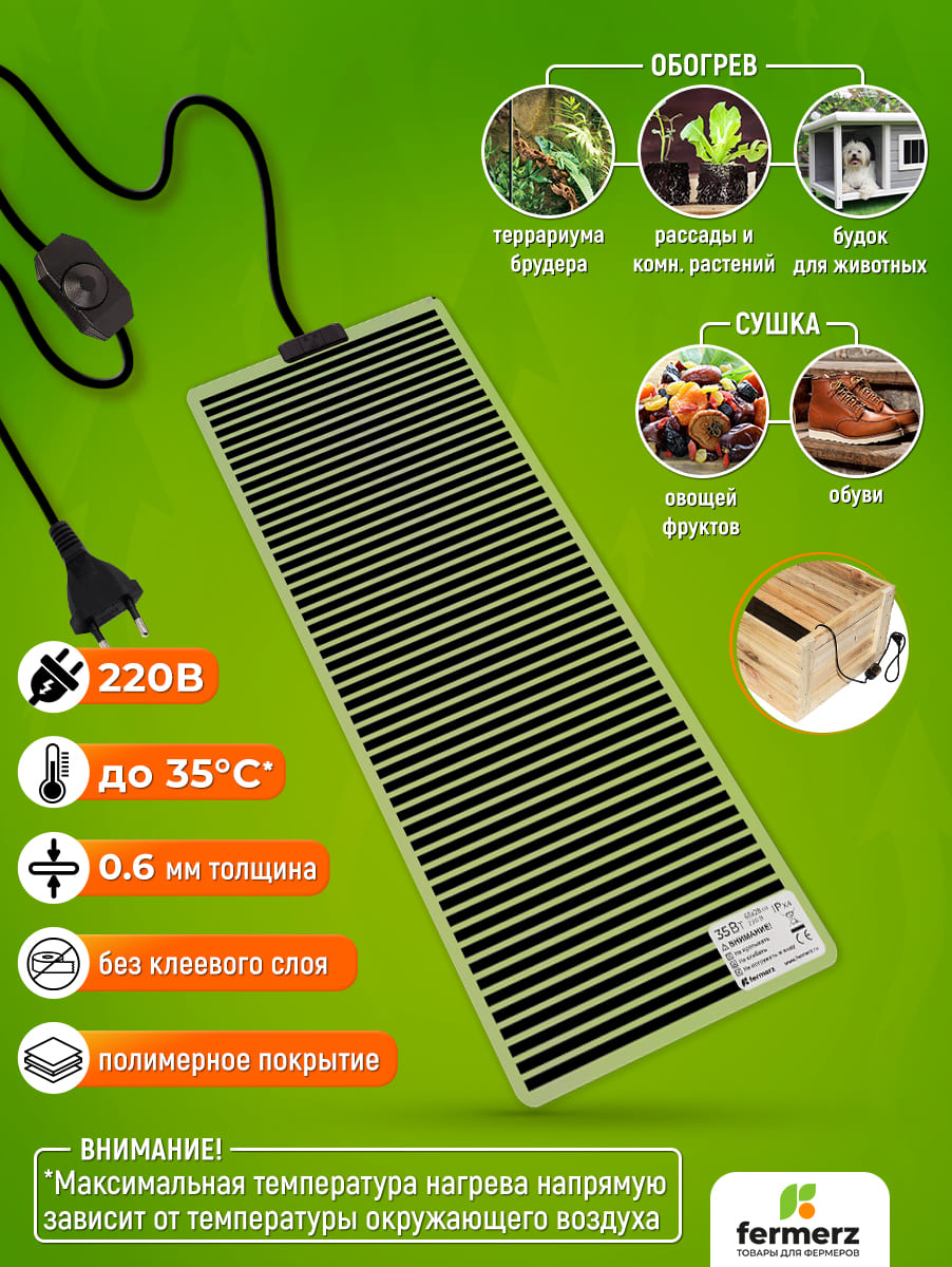 Греющий коврик для подогрева (термоковрик) мощностью 35 Ватт. Сферы применения: для подогрева террариумов рептилий, черепашек, змей, лягушек, пауков и т.п. Помимо этого применяется в хозяйственном назначении: подогрев рассады, погребов для овощей, сушки обуви, сушки овощей и т.д. Снабжён регулятором нагрева.