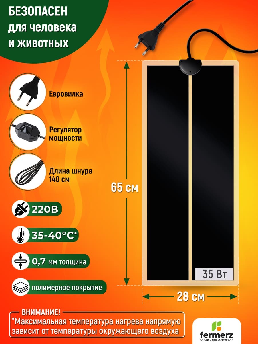 Греющий коврик для подогрева (термоковрик) мощностью 35 Ватт. Сферы применения: для подогрева террариумов рептилий, черепашек, змей, лягушек, пауков и т.п. Помимо этого применяется в хозяйственном назначении: подогрев рассады, погребов для овощей, сушки обуви, сушки овощей и т.д. Снабжён регулятором нагрева.