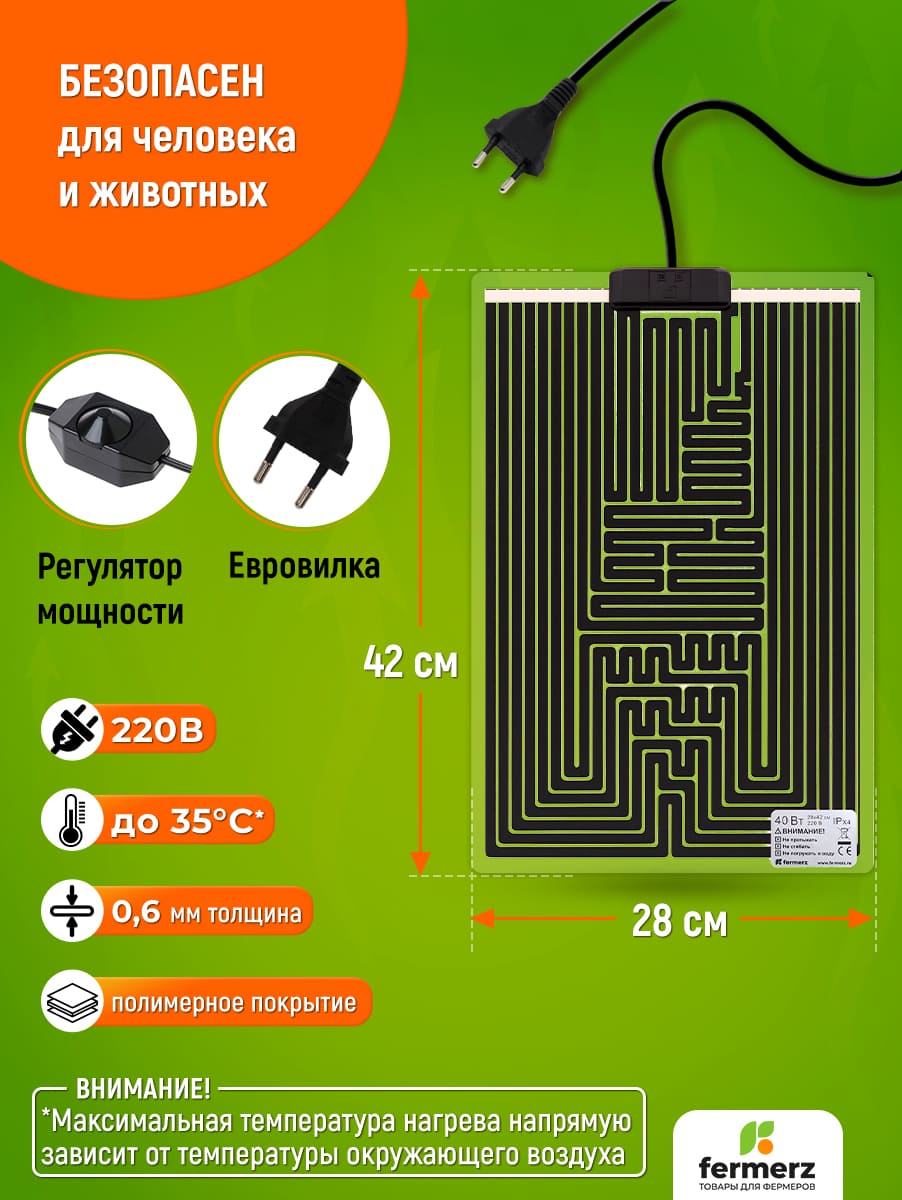 Греющий коврик для подогрева (термоковрик) мощностью 40 Ватт. Сферы применения: для подогрева террариумов рептилий, черепашек, змей, лягушек, пауков и т.п. Помимо этого применяется в хозяйственном назначении: подогрев рассады, погребов для овощей, сушки обуви, сушки овощей и т.д. Снабжён регулятором нагрева.