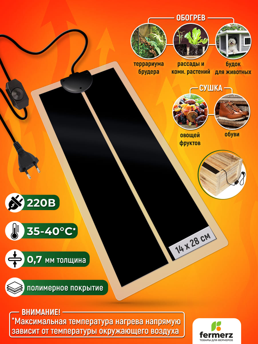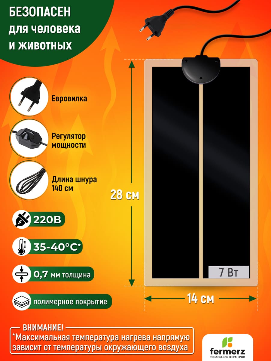 Греющий коврик для подогрева (термоковрик) мощностью 7 Ватт. Сферы применения: для подогрева террариумов рептилий, черепашек, змей, лягушек, пауков и т.п. Помимо этого применяется в хозяйственном назначении: подогрев рассады, погребов для овощей, сушки обуви, сушки овощей и т.д. Снабжён регулятором нагрева.