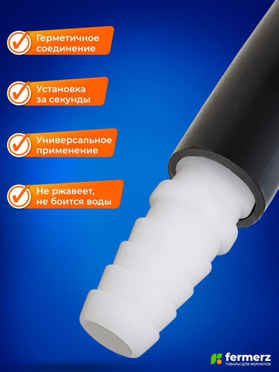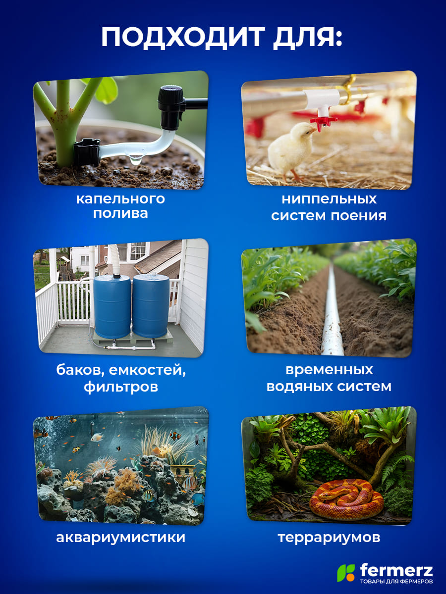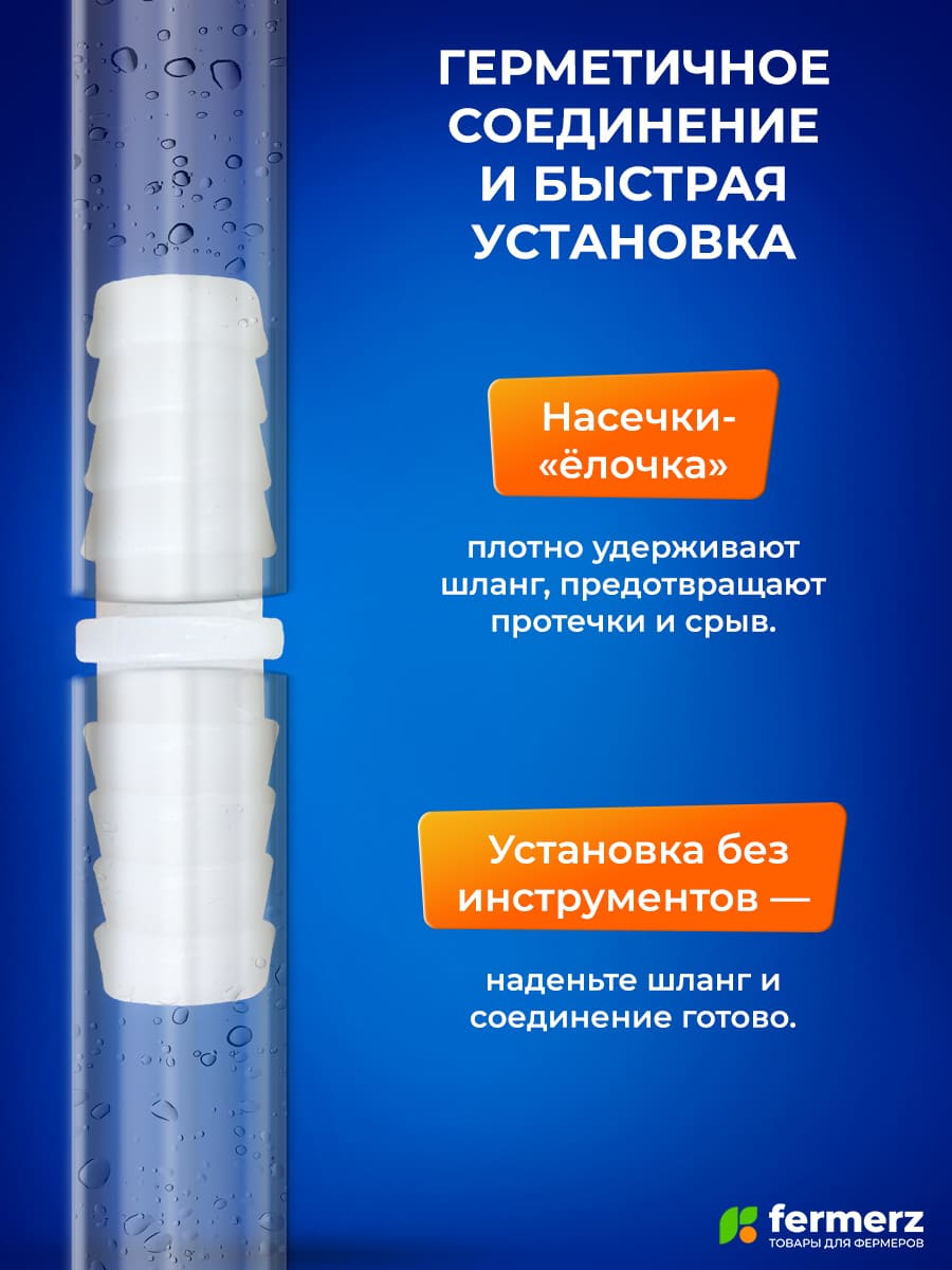 Муфта подходит для подключения капельного полива, ниппельных систем поения, небольших сантехнических узлов, рукомойников, баков и временных водопроводных линий. Простая конструкция облегчает установку, а полимерный материал устойчив к влаге и температурным перепадам.
