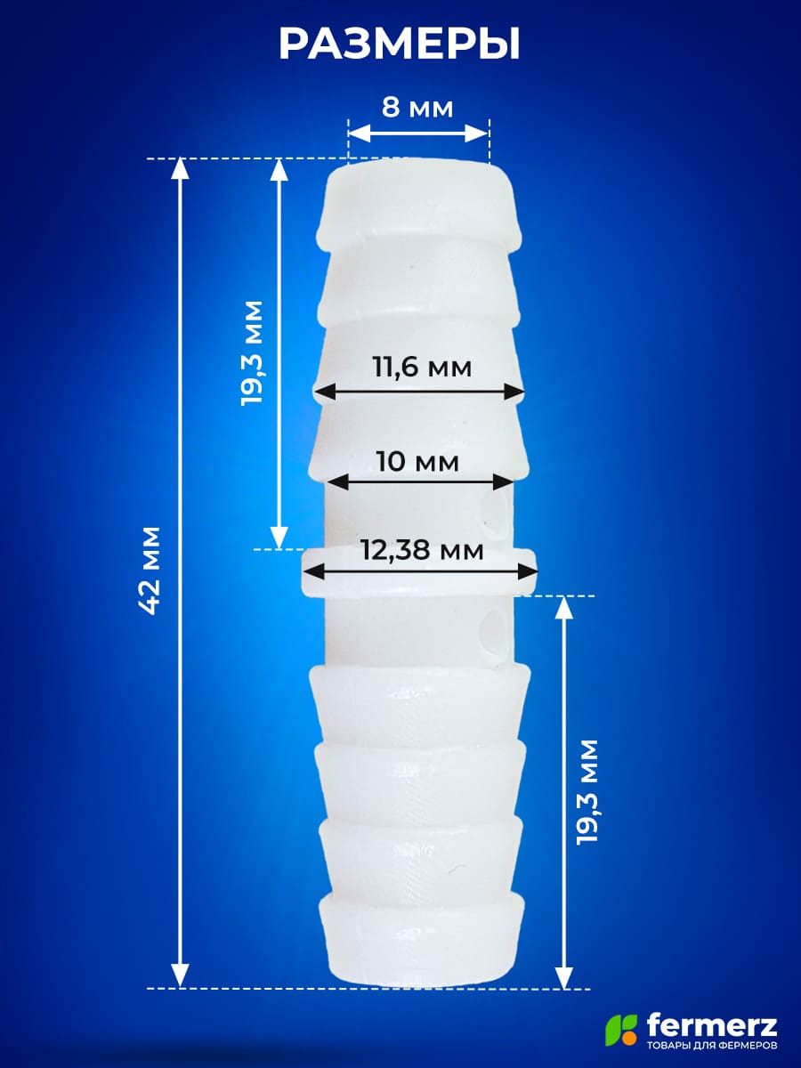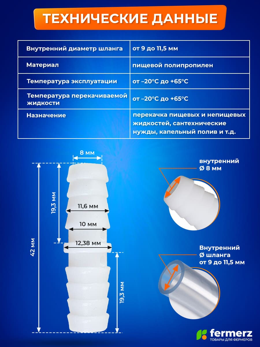 Пластиковая муфта 11 мм предназначена для гибких шлангов с внутренним диаметром 9-11,5 мм и наружным диаметром около 10–12 мм, обеспечивая надёжное и простое соединение при перекачке неагрессивных жидкостей