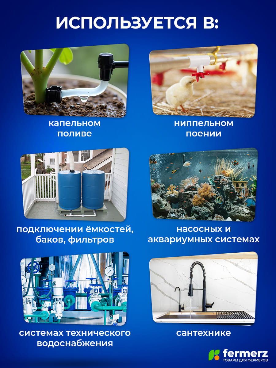 Комплект подходит для систем подачи воды, капельного полива, ниппельных поилок, а также для бытовых и технических жидкостей. Небольшие размеры позволяют устанавливать его даже в ограниченном пространстве. Монтаж выполняется вручную — просто, быстро и без использования инструмента.