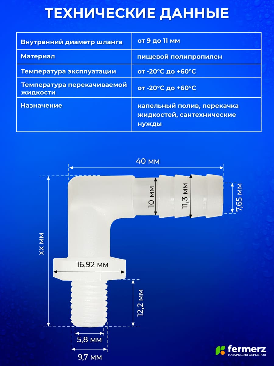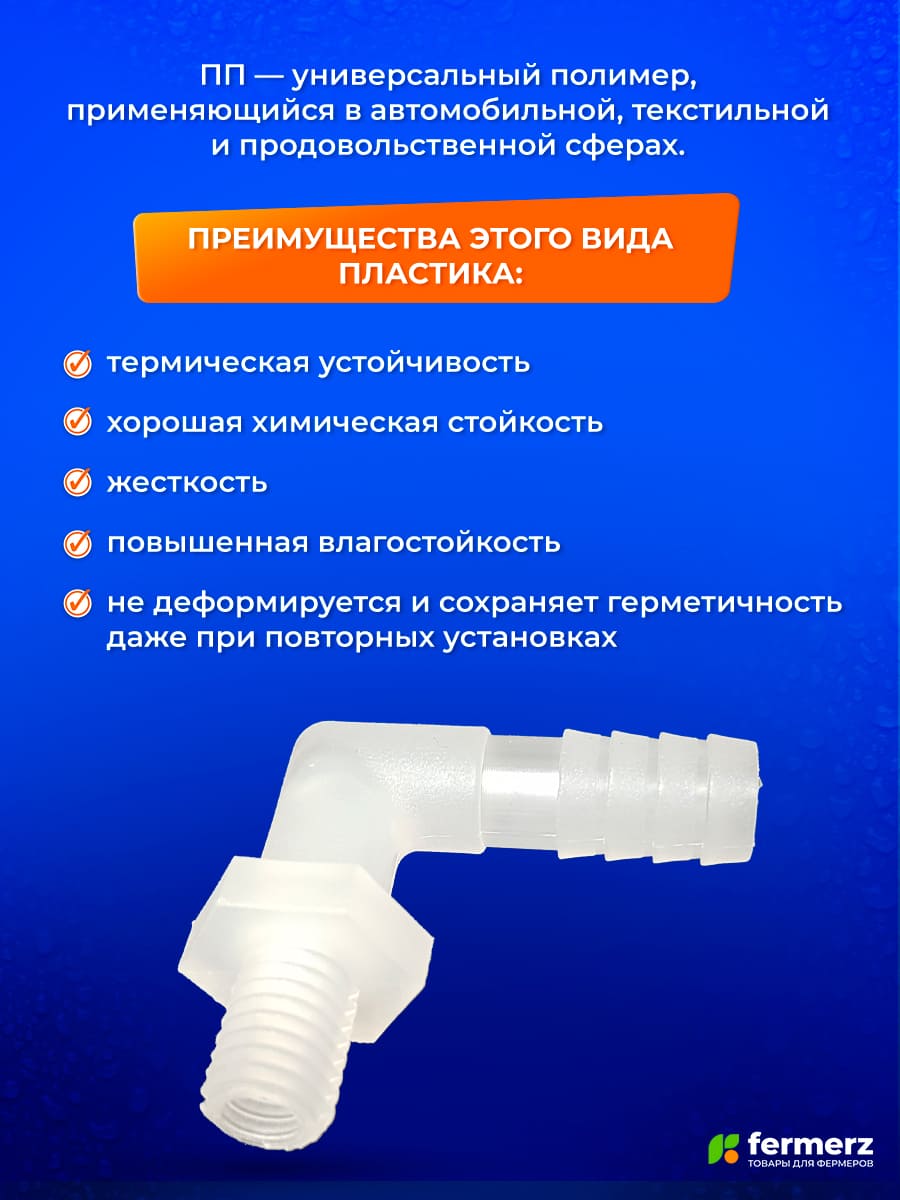 Прочный пластиковый угловой штуцер с наружной резьбой и посадкой под шланг 10 мм. Идеально подходит для подключения гибких шлангов в условиях ограниченного пространства, когда необходимо повернуть линию на 90°