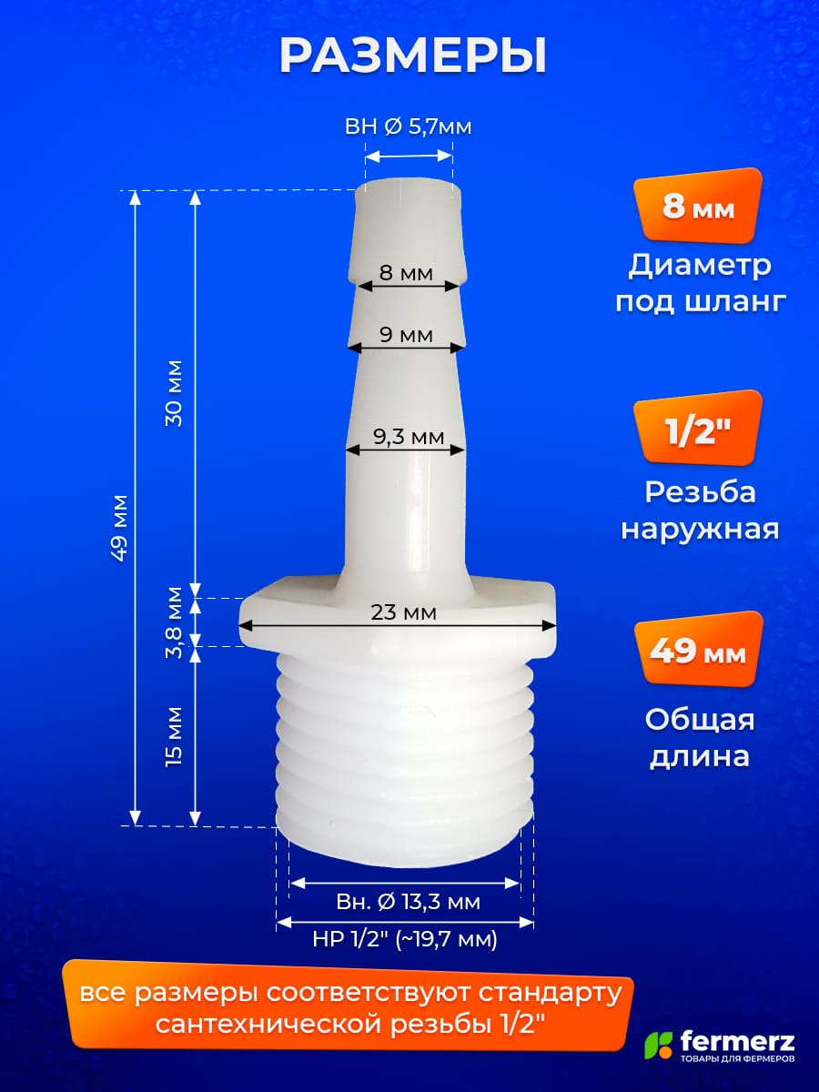 Форма «ёлочка» обеспечивает надёжную фиксацию шланга без дополнительного крепежа. Штуцер 1/2 елочка 8мм легко вкручивается в отверстие с внутренней резьбой 1/2″ — это может быть штуцер для бочки, штуцер для поилки или любой другой узел системы. Он также используется как штуцер переходной, если необходимо организовать переход от резьбового соединения на гибкую трубку.