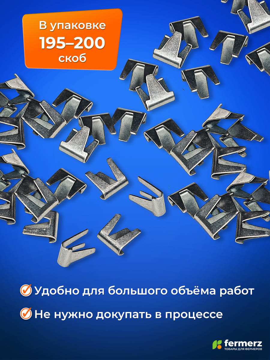 Размер каждой скобы для степлера составляет 1,2 см на 1,1 см, что делает её универсальной для множества применений, от монтажа ограждений до соединения стержней и сеток. Диаметр обжима варьируется от 5 до 6 мм, что гарантирует стабильное крепление без риска ослабления соединения.